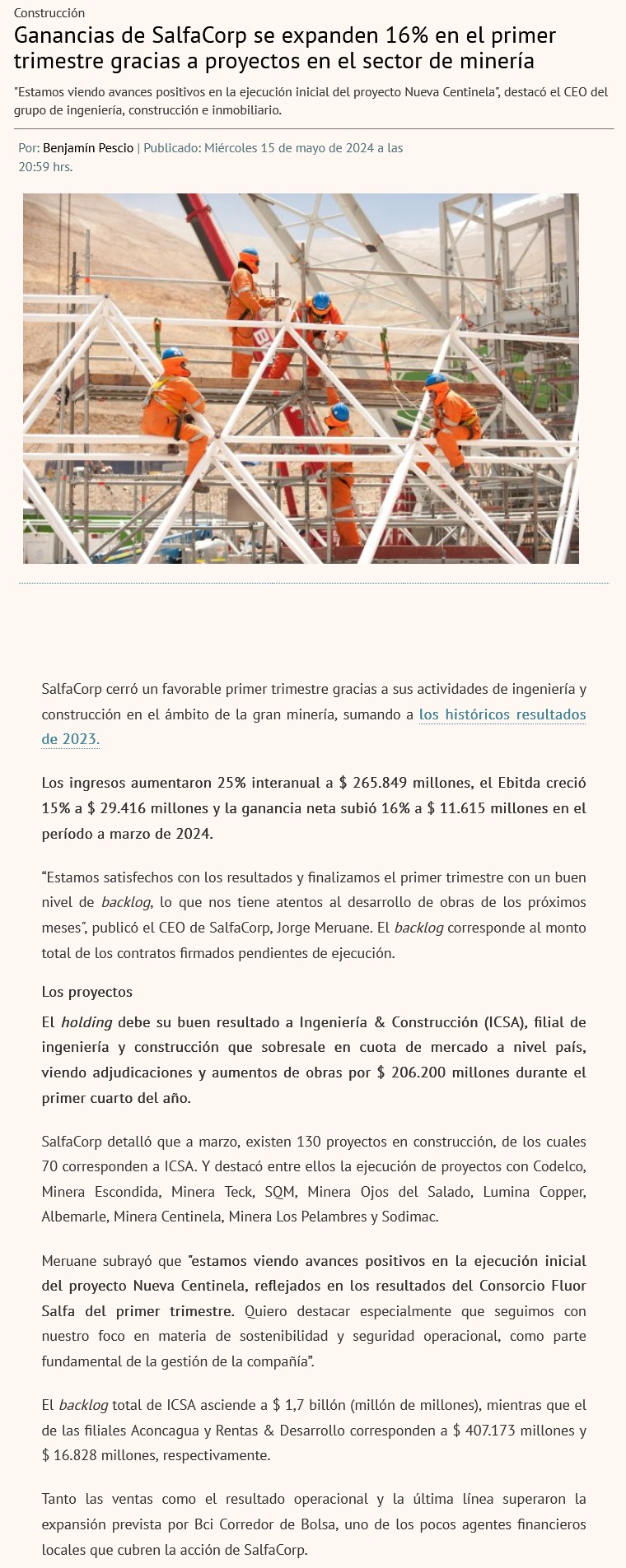 Ganancias de Salfacorp aumentan 15% en el primer cuarto del año - (La Tercera Online)