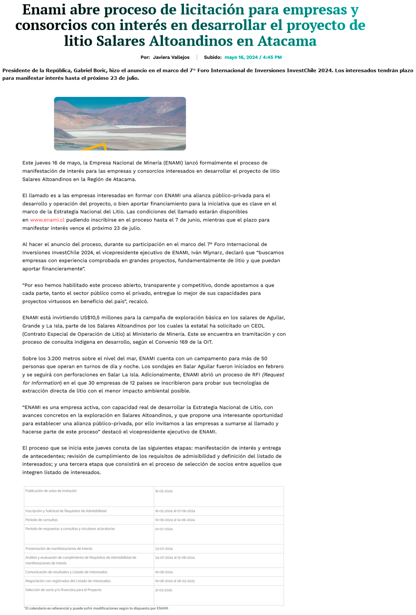 Enami inicia búsqueda de socio en litio - (El Mercurio de Santiago)