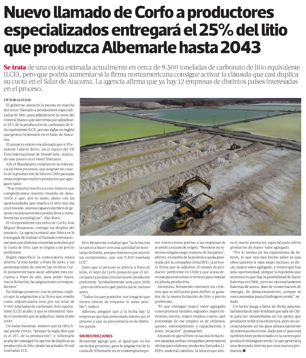 Anuncian llamado a productores especializados en litio para acceder a cuota preferente de Albemarle - (El Mercurio de Antofagasta)