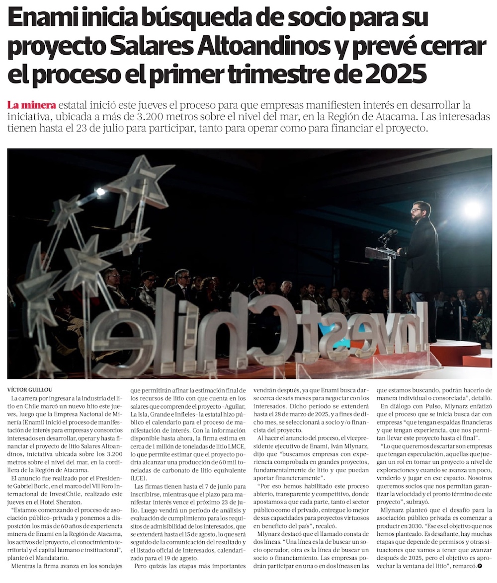 Enami inicia búsqueda de socio en litio - (El Mercurio de Santiago)