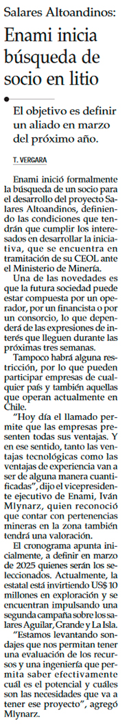Enami inicia búsqueda de socio para su proyecto Salares Altoandinos y prevé cerrar el proceso el primer trimestre de 2025 - (Pulso)