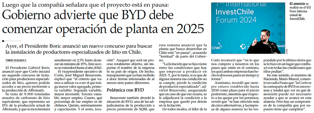 Polémica con BYD escala: Corfo afirma que si no empieza a producir en 2025, la firma china perderá cuota asignada de litio - (Pulso)