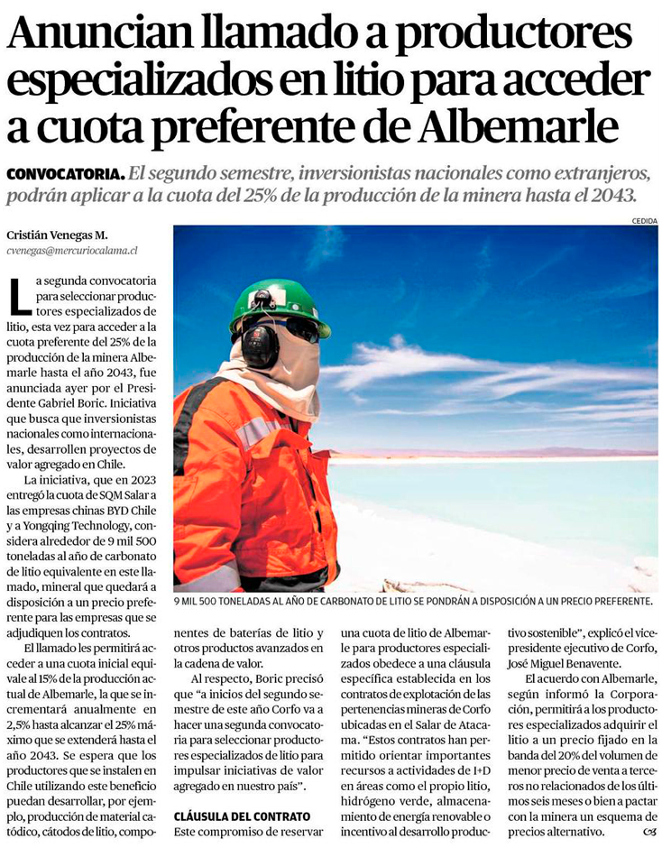 Nuevo llamado de Corfo a productores especializados entregará el 25% del litio que produzca Albemarle hasta 2043 - (Pulso)