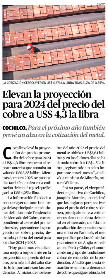 Cochilco eleva estimaciones del precio del metal rojo para 2024 y 2025 - (Pulso)