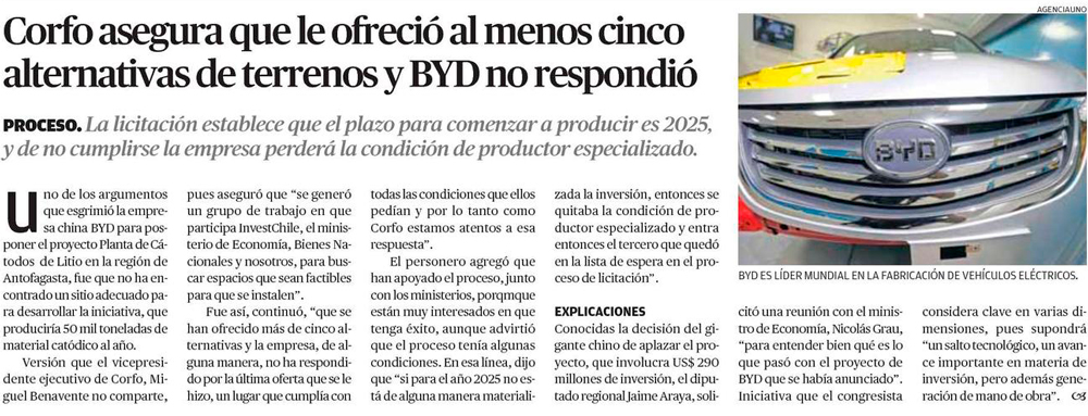 Gobierno advierte que BYD debe comenzar operación de planta en 2025 - (El Mercurio de Santiago)