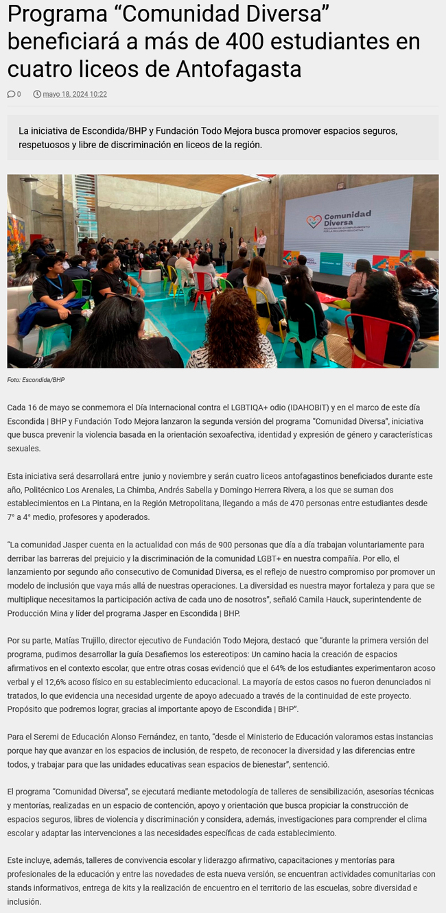 Más de 400 estudiantes de Antofagasta participarán en programa ‘Comunidad Diversa’ - (soyantofagasta)