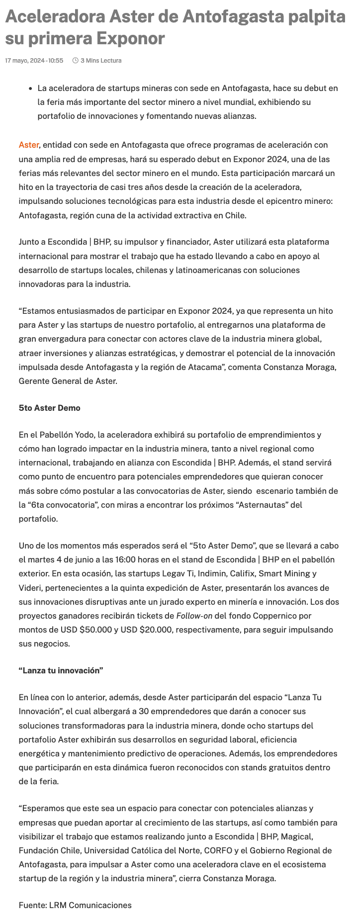 Aceleradora Aster de Antofagasta palpita su primera Exponor - (presslatam.cl)