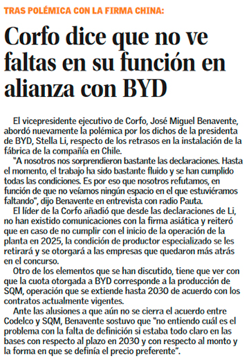 Corfo responde a BYD: “Nos parecen bastante curiosas las declaraciones, ya que no veo ningún punto en el que estemos faltando” - (Pauta)
