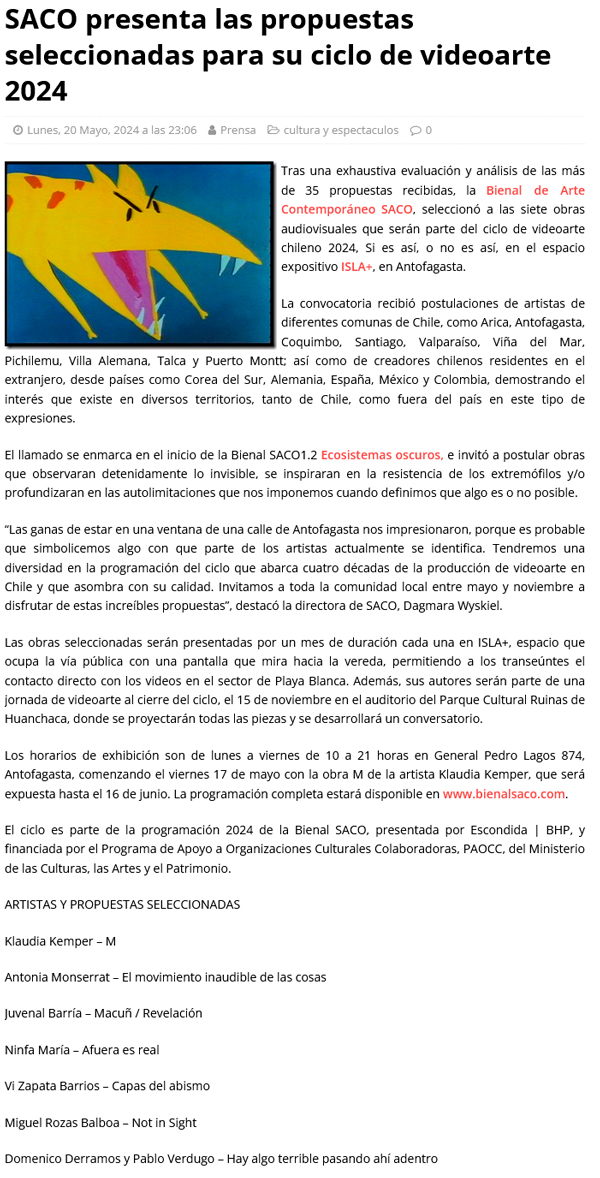 SACO presenta las propuestas seleccionadas para su ciclo de videoarte 2024 - (regionesnoticias.cl)