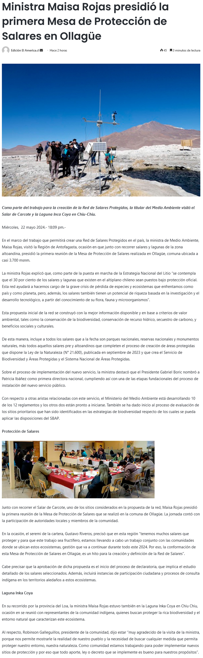 Ministra Rojas presidió la primera Mesa de Protección de Salares - (El Mercurio de Antofagasta)