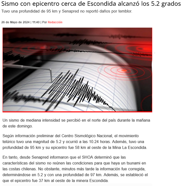 Sismo con epicentro cerca de Escondida alcanzó los 5,2 grados - (El Mercurio de Antofagasta)