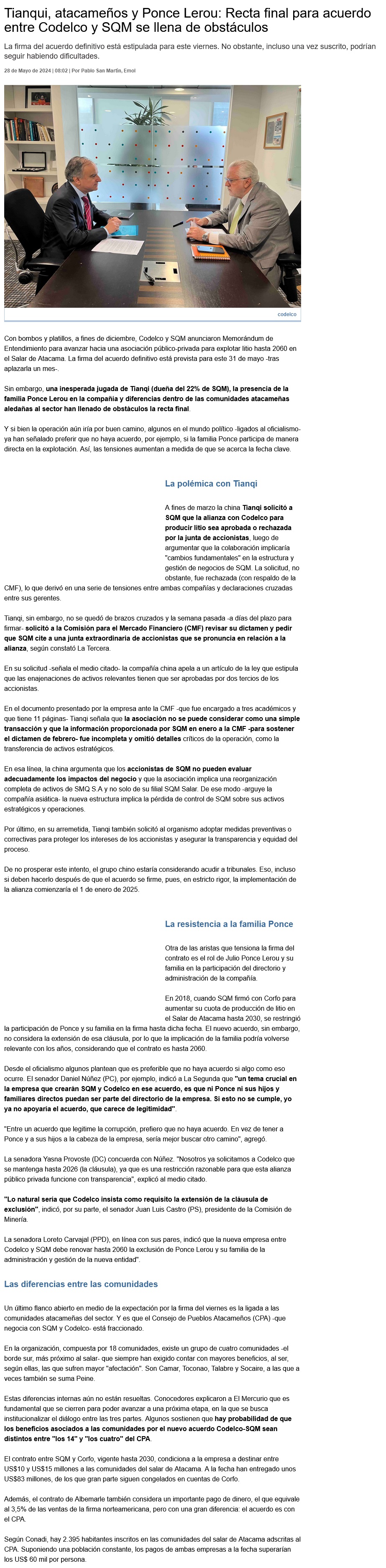 Experto en minerĂa: Creo que el acuerdo Codelco-SQM se va a producir, pese a Tianqi y Ponce Lerou - (cooperativa online)