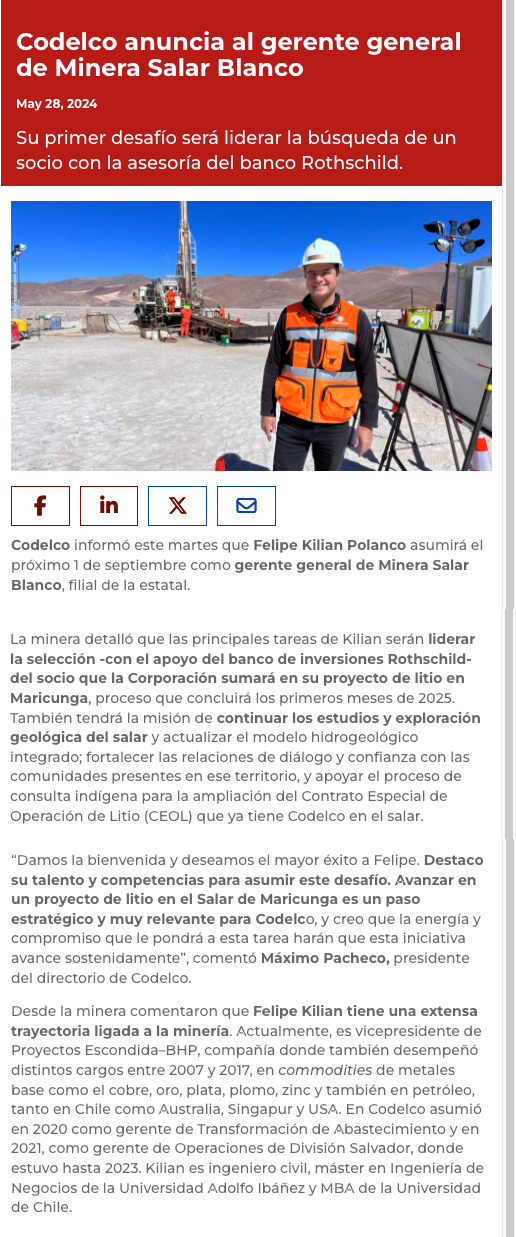 Felipe Kilian asume como gerente general en Minera Salar Blanco de Codelco - (mineriayfuturo.cl)