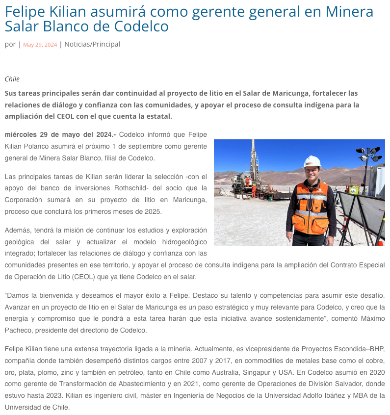 Felipe Kilian asume como gerente general en Minera Salar Blanco de Codelco - (mineriayfuturo.cl)