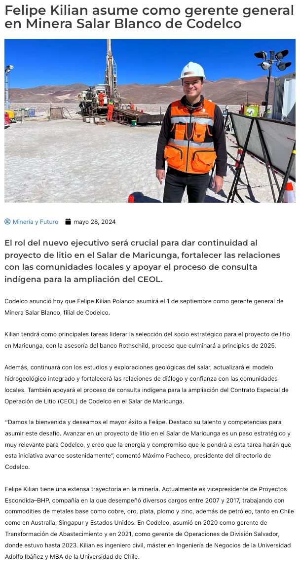 Codelco anuncia al gerente general de Minera Salar Blanco - (mch.cl)