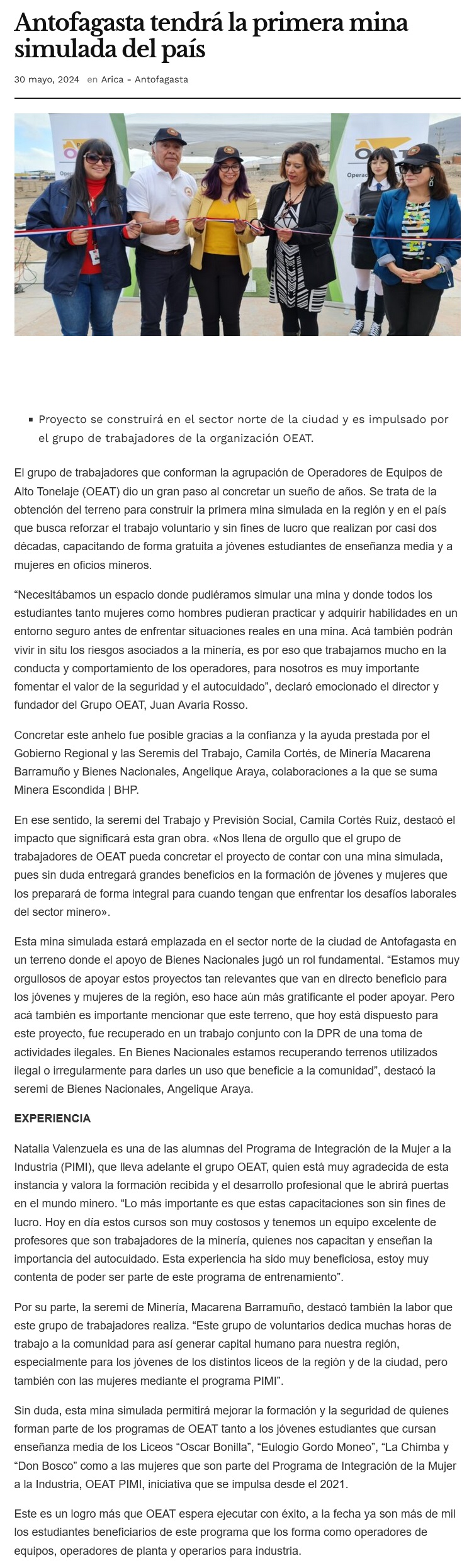 Antofagasta contará con la primera Mina Simulada en Chile para capacitar a jóvenes y mujeres en oficios mineros - (madero.cl)