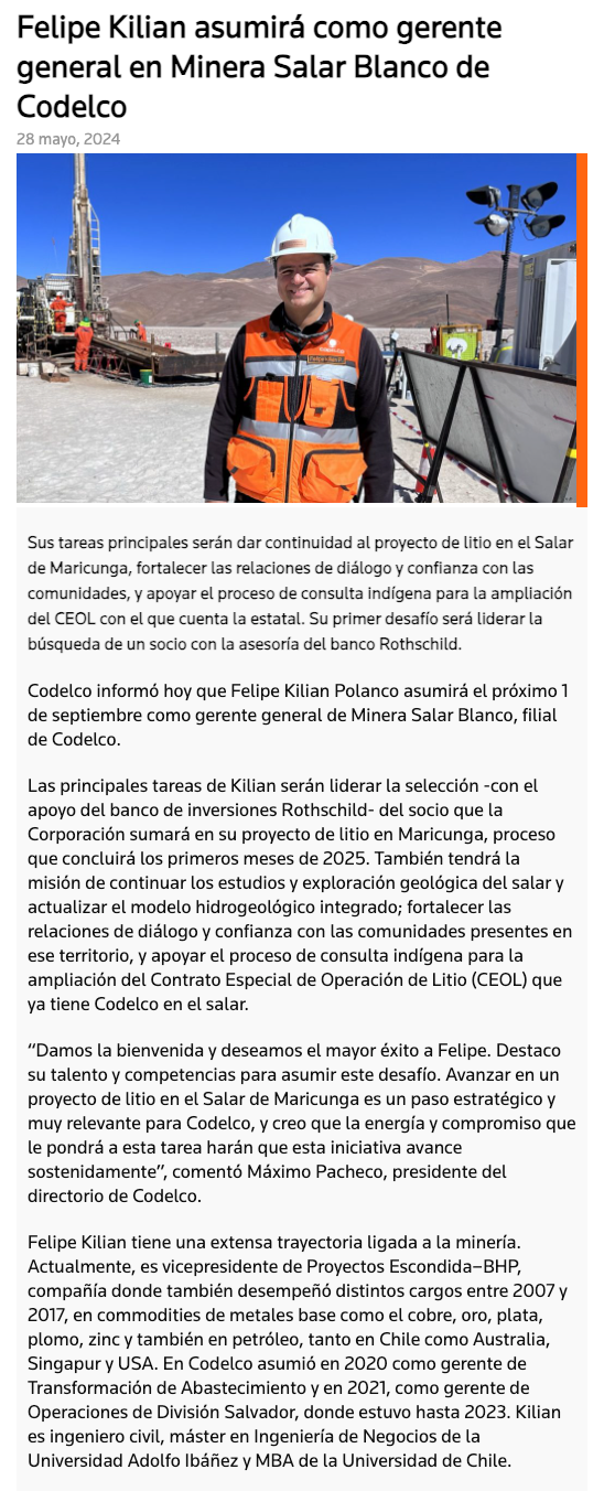 Felipe Kilian asume como gerente general en Salar Blanco - (24 Horas)