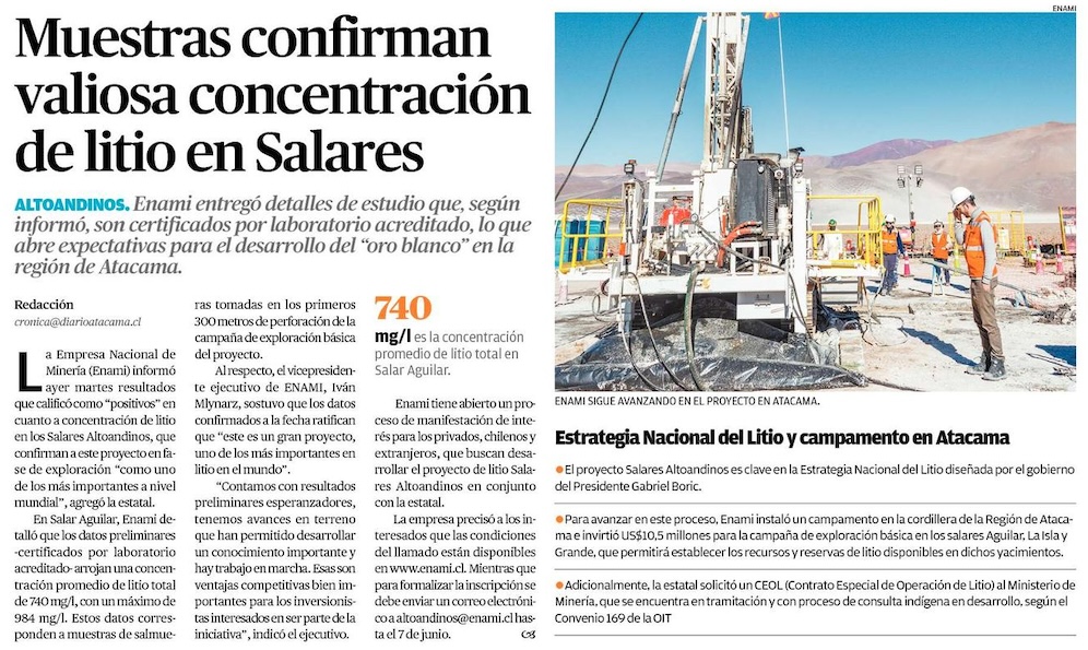 Enami reporta “esperanzadores” resultados en litio - (El Mercurio de Santiago)