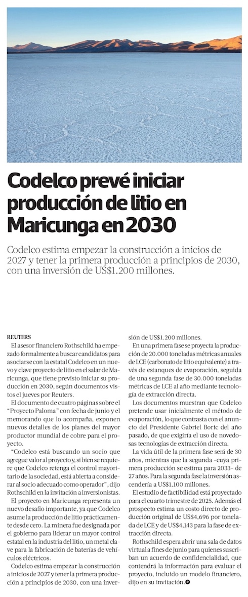 Litio en Chile: Codelco prevé iniciar producción en Maricunga en 2030 - (americaeconomia online)