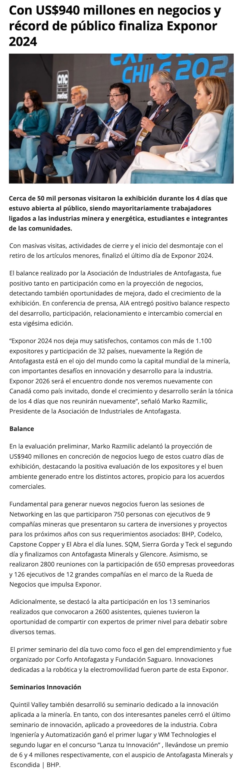 Exponor 2024 proyectó negocios por US$940 millones - (diarioantofagasta)