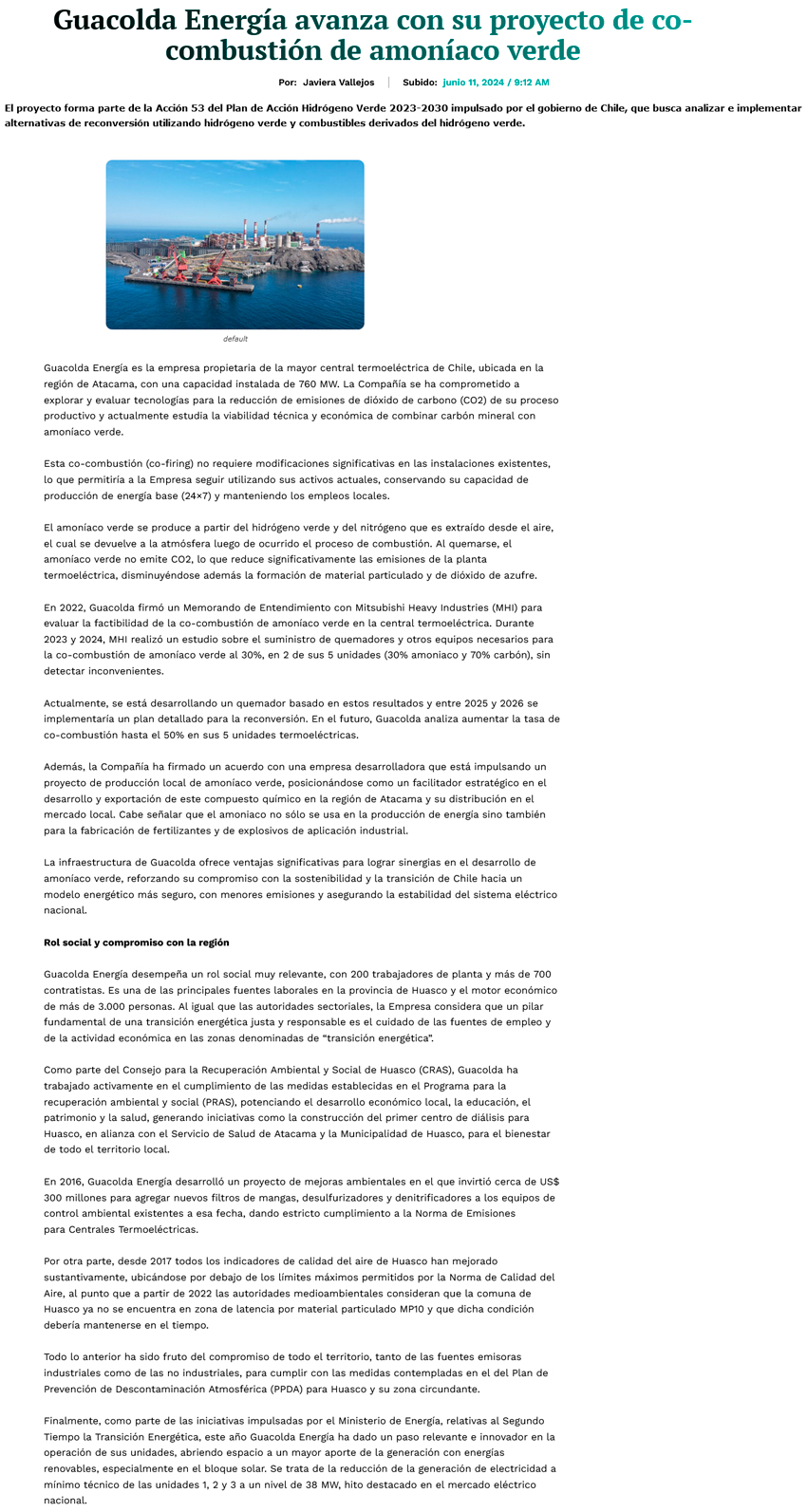 Guacolda Energía avanza con su proyecto co-combustión de amoníaco verde - (El Chañarcillo)