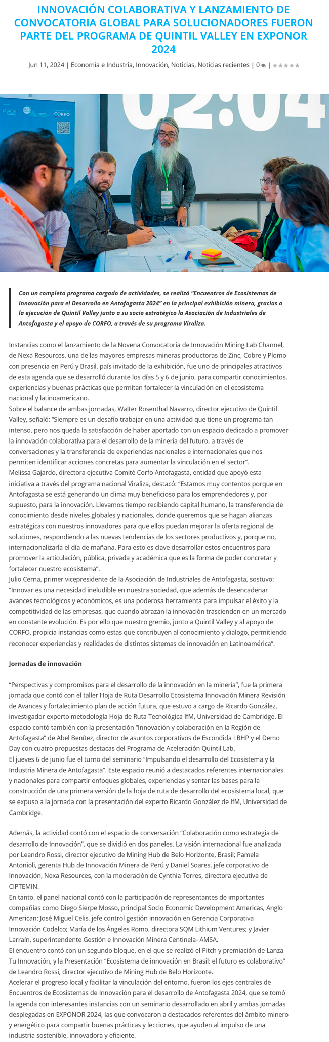 Innovación colaborativa y lanzamiento de convocatoria global para solucionadores fueron parte del Programa de Quintil Valley en EXPONOR 2024 - (regionesnoticias.cl)