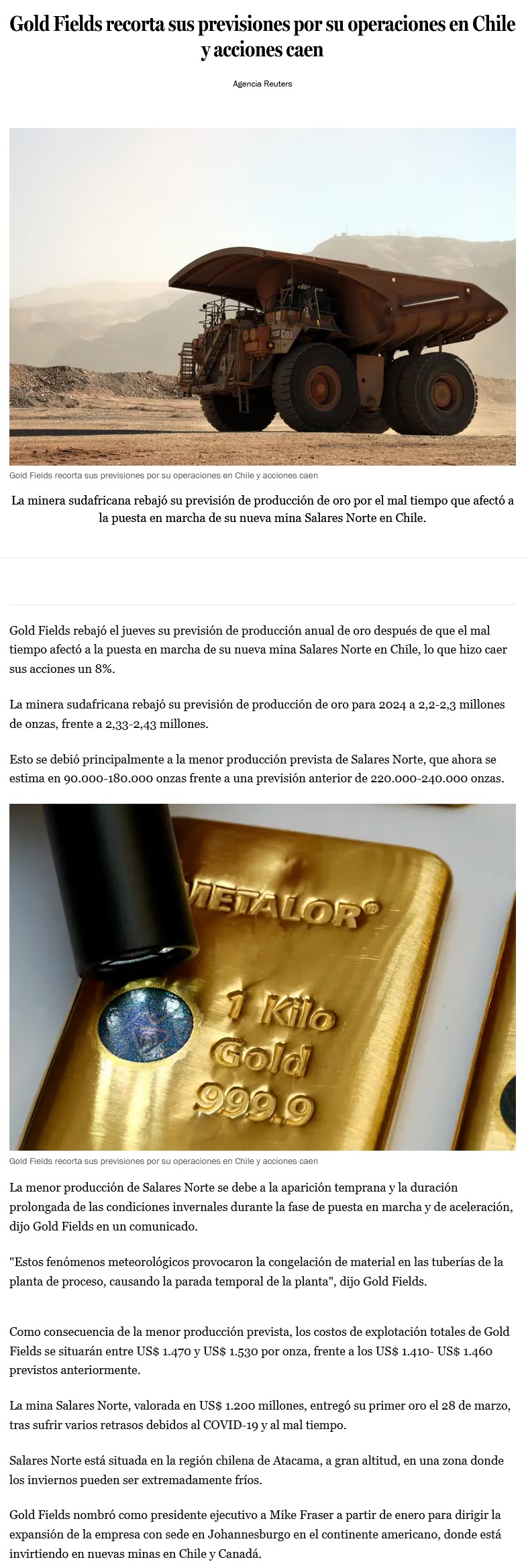 Las acciones de Gold Fields caen por el impacto en la producción de clima helado en Chile - (DF Online)