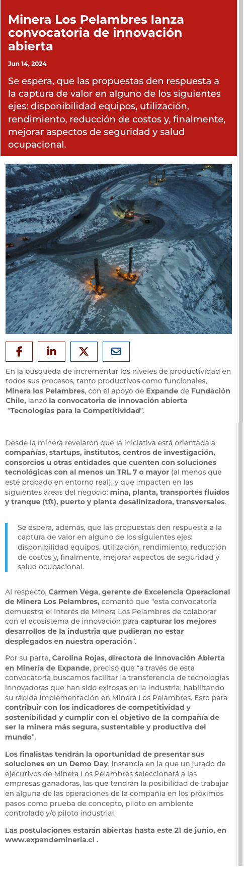 Minera Los Pelambres lanza convocatoria en la búsqueda de las mejores tecnologías para incrementar su productividad - (Semanario Tiempo)