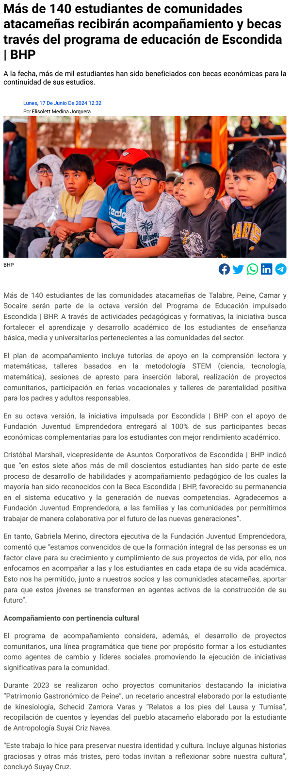 Más de 140 estudiantes de comunidades atacameñas recibirán acompañamiento y becas través del programa de educación de Escondida | BHP - (diarioangamos)