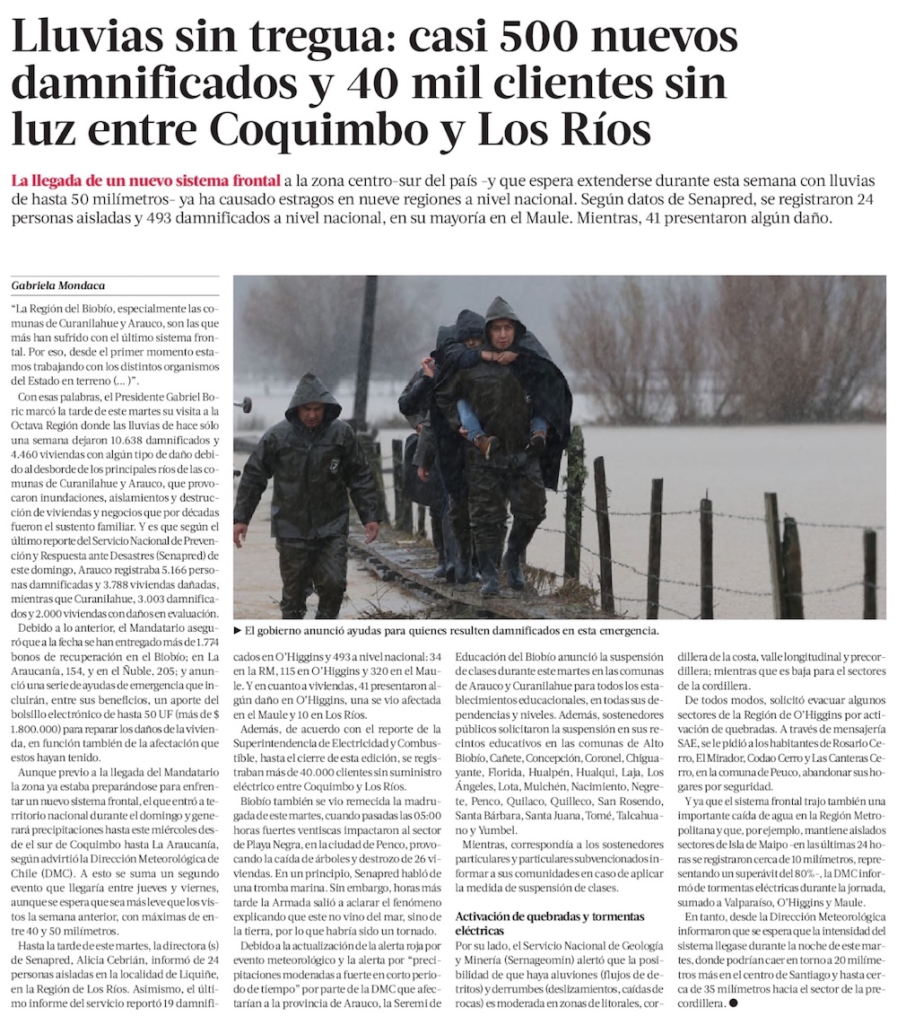 Boric viaja al sur y anuncia ayuda para afectados por sistema frontal - (La Tercera)