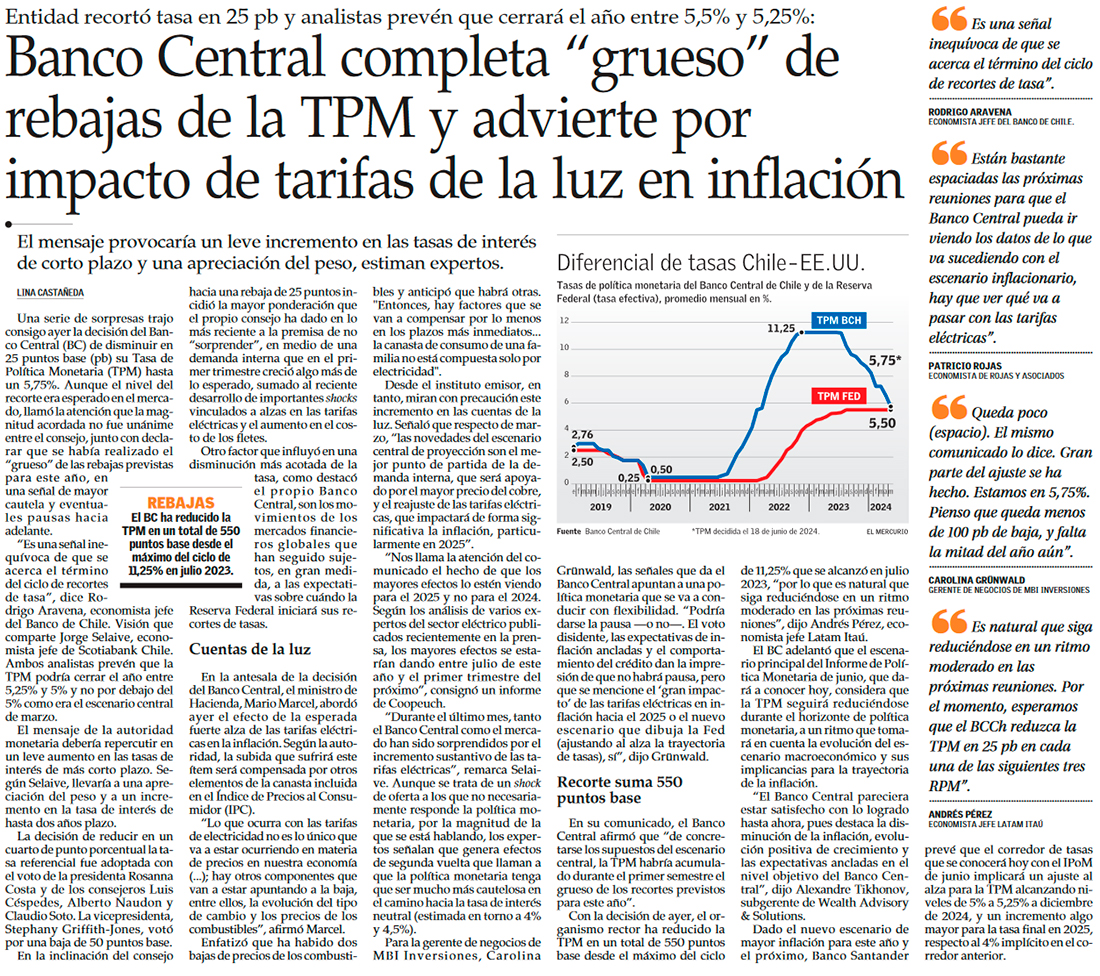 Banco Central abre camino a una pausa en la baja de tasas y advierte que alza de la luz afectará IPC sobre todo en 2025 - (Diario Financiero)