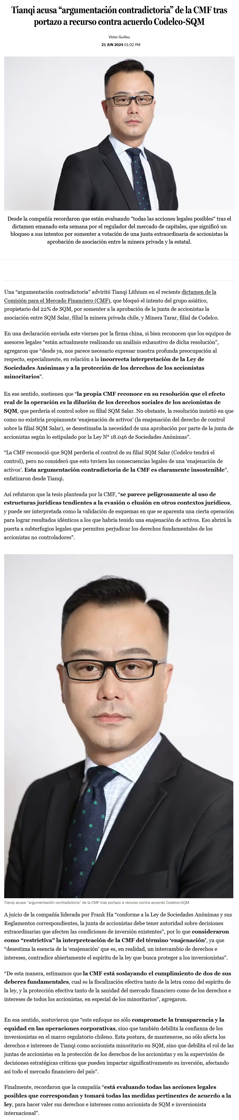 Tianqi y dictamen de la CMF por acuerdo de SQM: "debilita la confianza de inversionistas" - (El Mercurio de Calama)