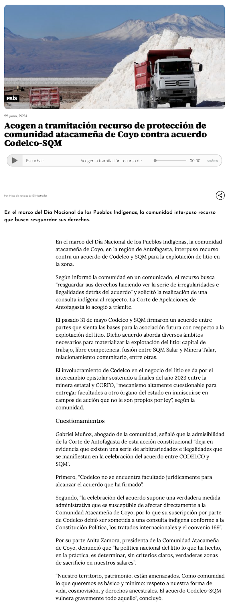 Tribunal acoge a tramitación recurso de protección contra acuerdo Codelco-SQM - (El Mercurio de Antofagasta)