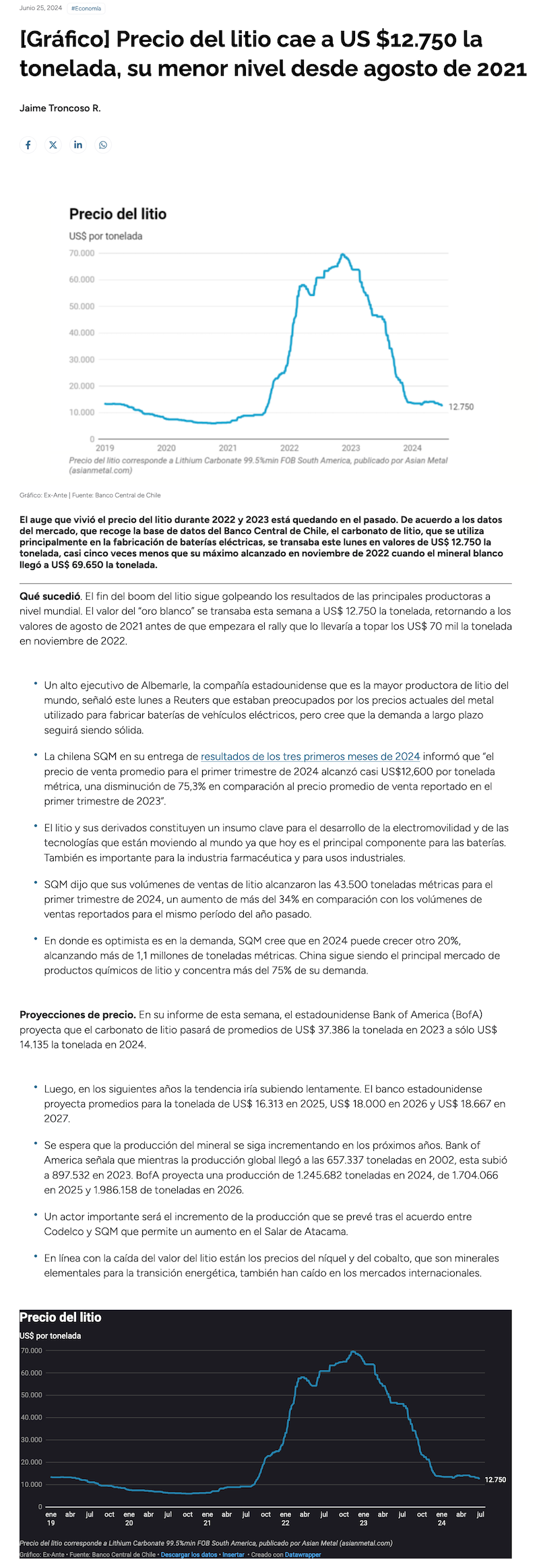 Presión para SQM: Valor del litio cae y borra todo lo avanzado el 2024 - (El Mercurio de Santiago)