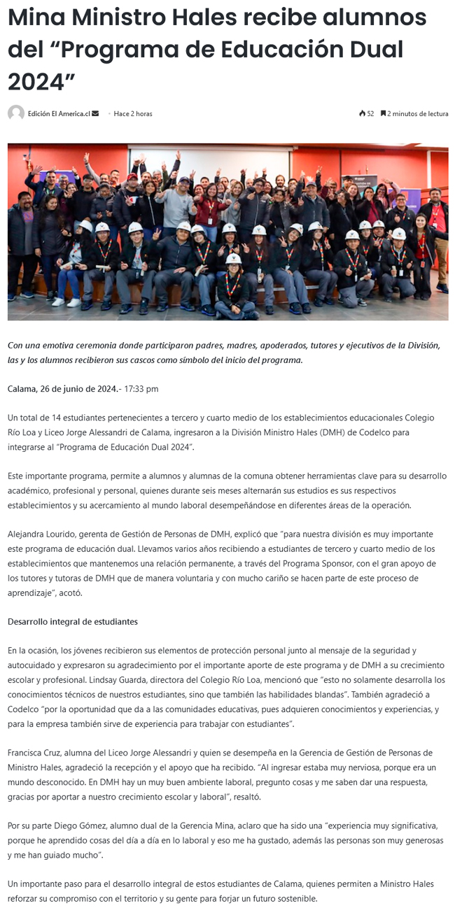 Ministro Hales recibe a nuevos alumnos del "Programa de Educación Dual 2024" - (El Mercurio de Antofagasta)