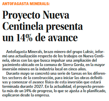 Proyecto minero Nueva Centinela del grupo Luksic inició las obras mayores y tiene 14% de avance - (DF Online)