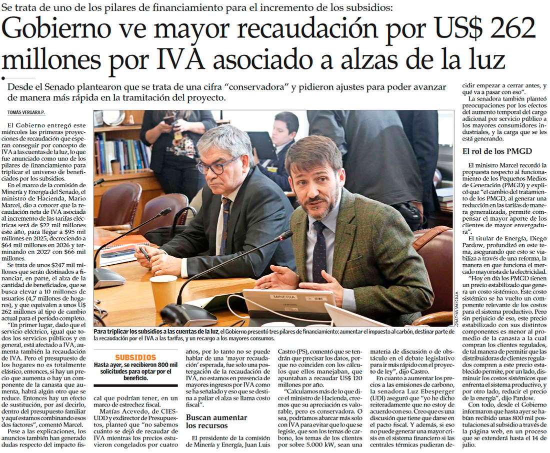 Alza de tarifas eléctricas: cálculo por recaudación de IVA abre primeras diferencias en debate por mayor subsidio - (Diario Financiero)