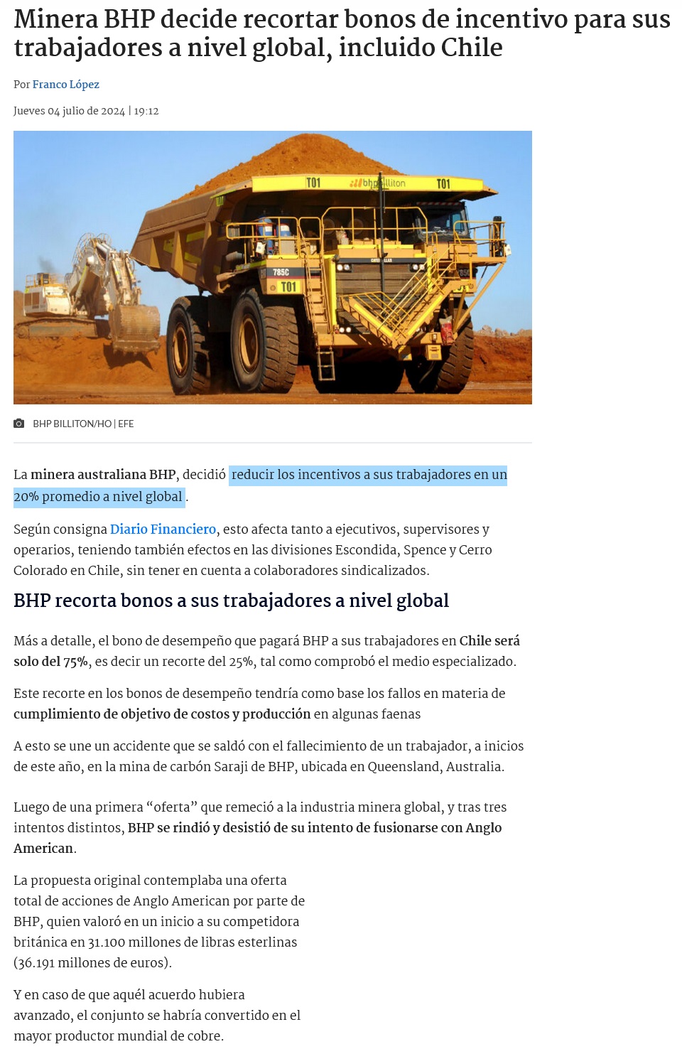 BHP recorta incentivos a empleados en todo el mundo tras no alcanzar objetivos de desempeño - (La Tercera Online)
