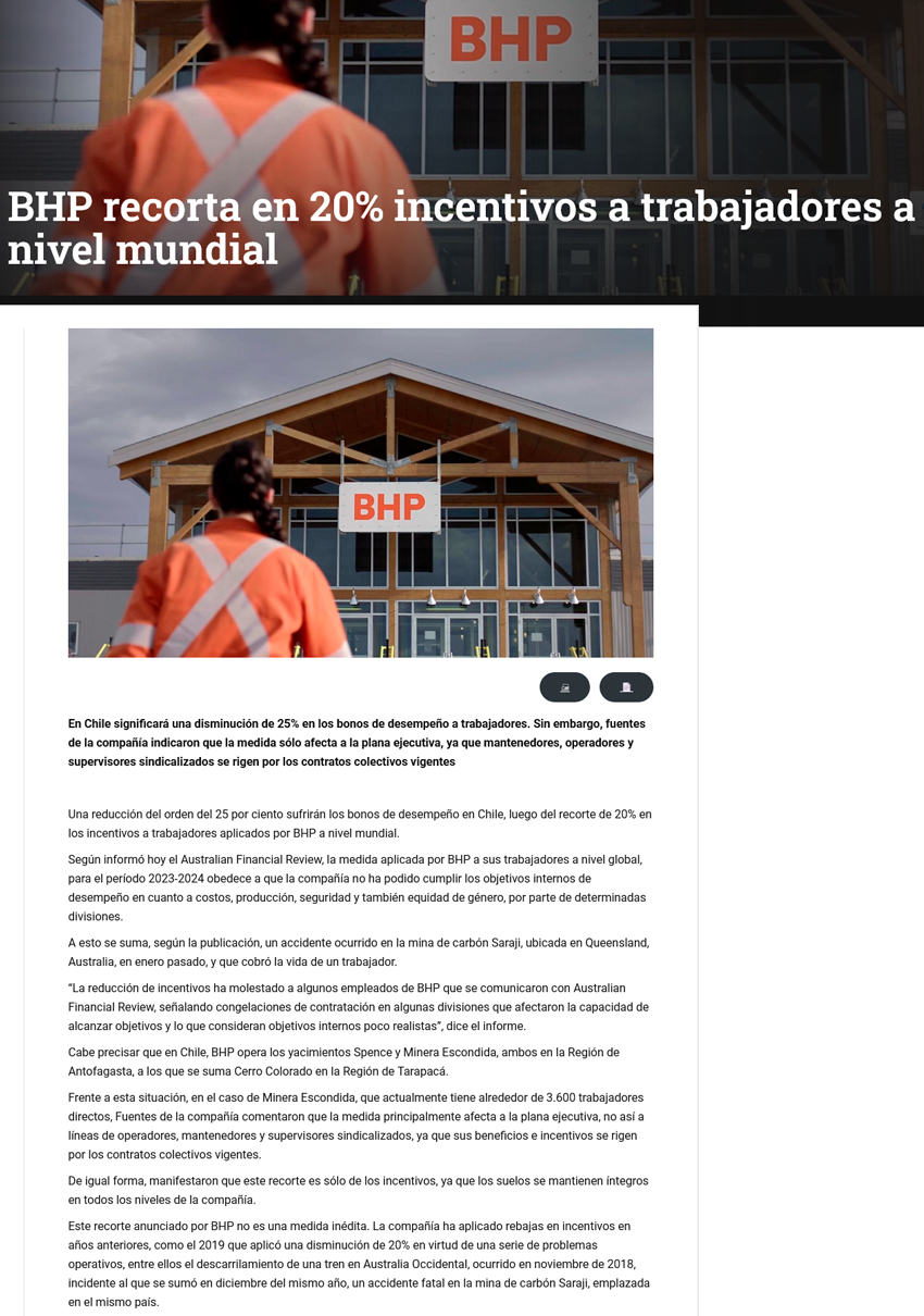 Minera BHP decide recortar bonos de incentivo para sus trabajadores a nivel global, incluido Chile - (biobiochile online)