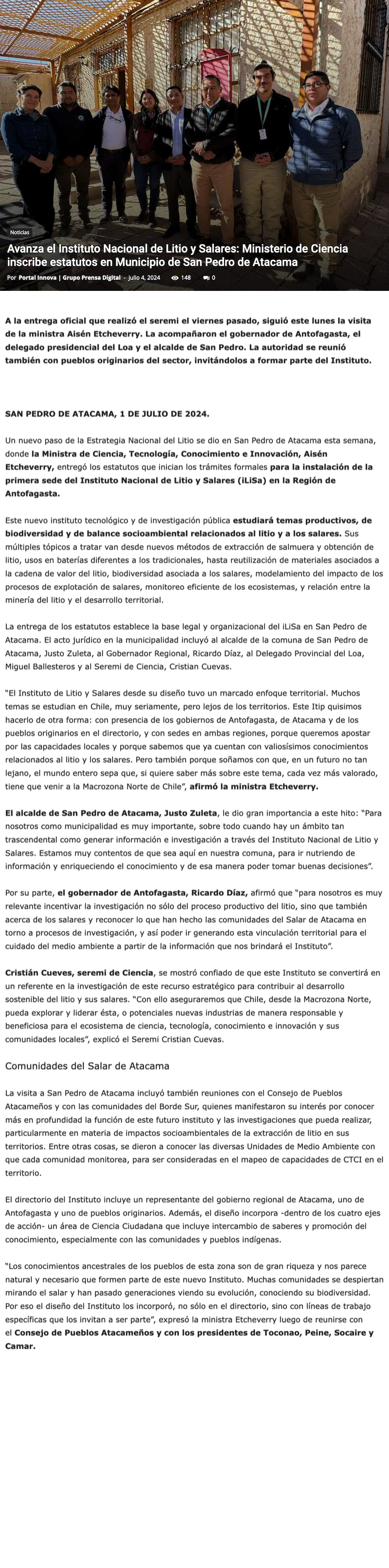 Avanza el Instituto Nacional de Litio y Salares: Ministerio de Ciencia inscribe estatutos en Municipio de San Pedro de Atacama - (reporteminero)