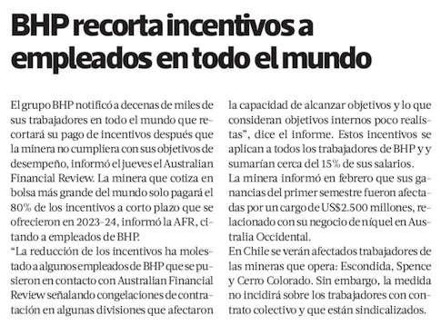 BHP recorta en un 20% incentivos a sus trabajadores a nivel mundial - (reporteminero)