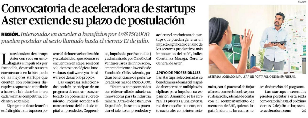 Convocatoria de aceleradora de startups Aster extiende su plazo de postulación - (El Mercurio de Calama)