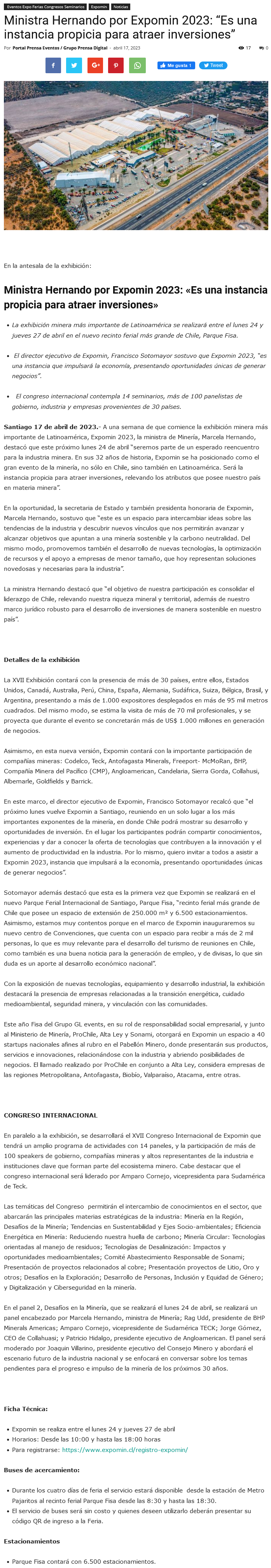 En la antesala de la exhibición: Ministra Hernando por Expomin 2023: “Es una instancia propicia para atraer inversiones” - (mvcomunicaciones.cl)