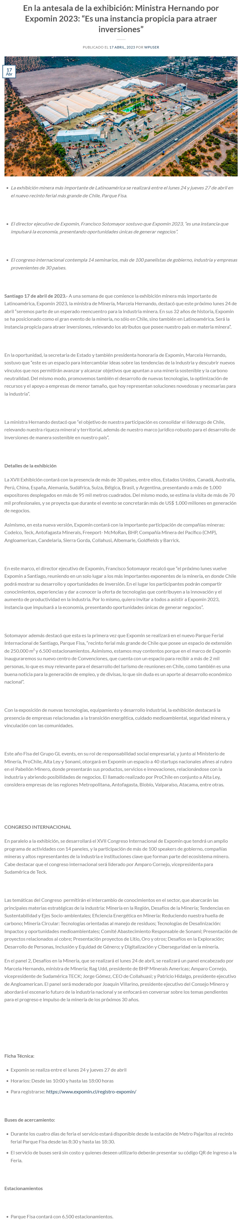 Ministra Hernando por Expomin 2023: “Es una instancia propicia para atraer inversiones” - (mch.cl)