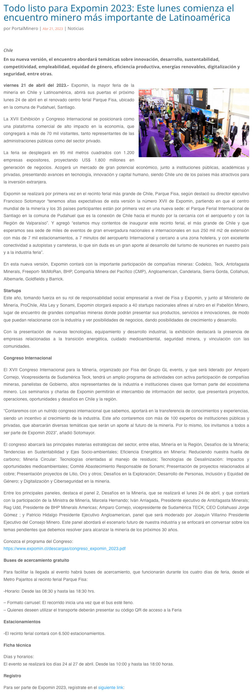 Este lunes comienza Expomin 2023, el encuentro minero más importante de Latinoamérica - (portalinnova.cl)