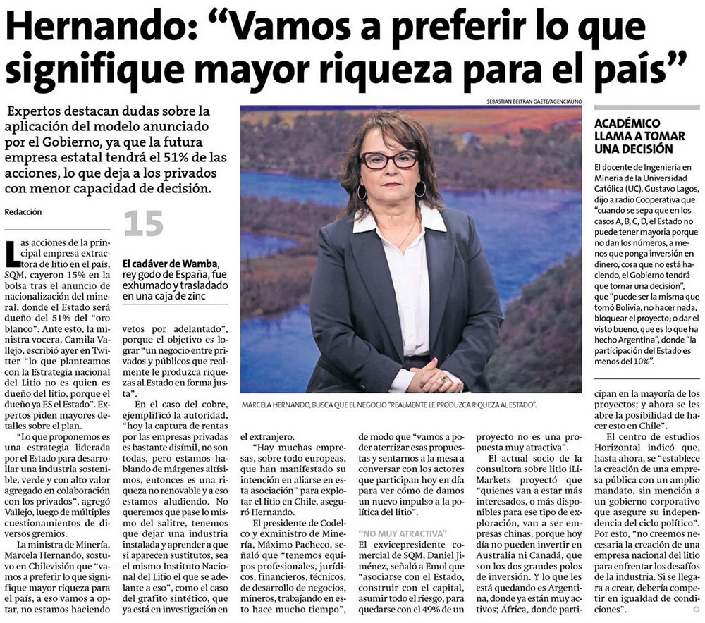 Hernando y futuro de la relación con SQM por el litio: "Las condiciones que están en los contratos actuales son un piso" - (emol)