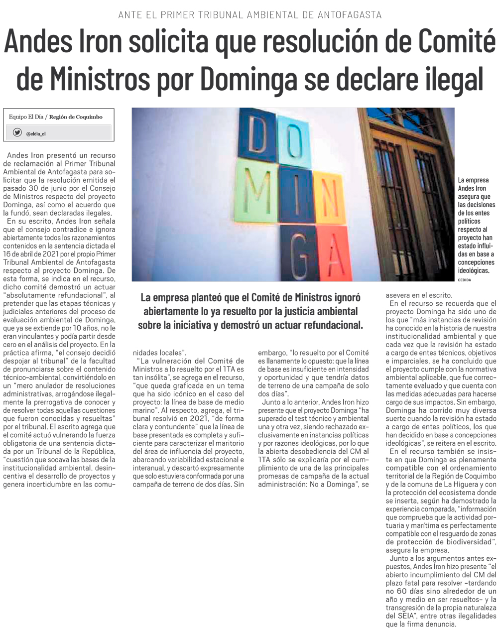 Andes Iron pidió que se declare ilegal resolución de ministros contra Dominga - (El Diario de Atacama)
