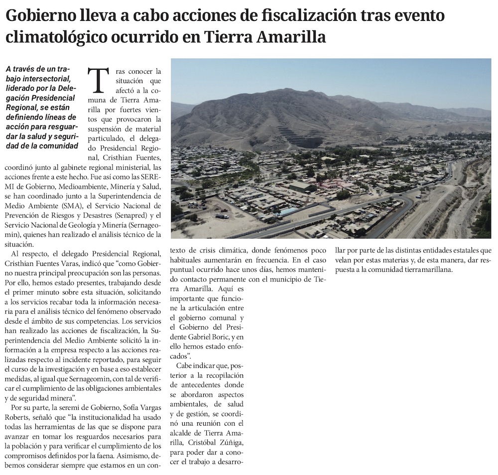 Tierra Amarilla declara emergencia comunal por material particulado de relave en el aire - (atacamanoticias)