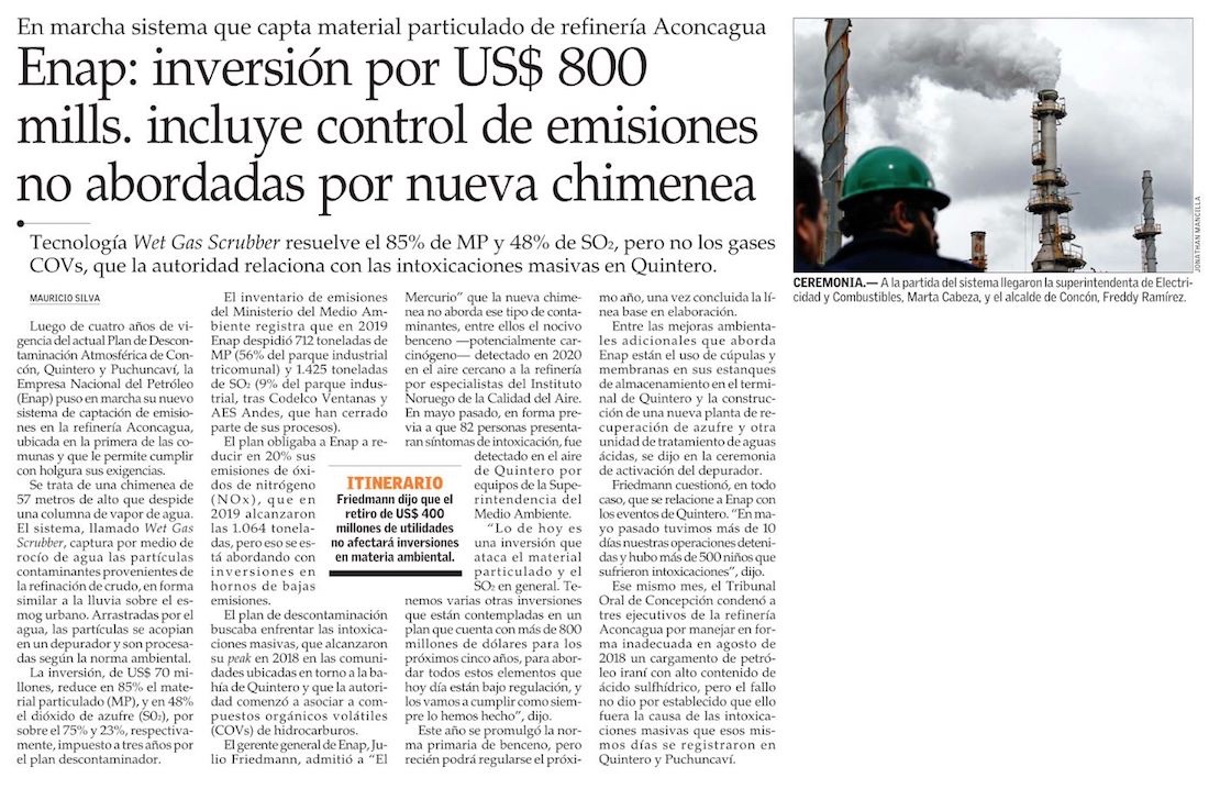 ENAP inaugura nuevo filtro que reduce emisiones contaminantes en refinería - (El Mercurio de Valparaíso)