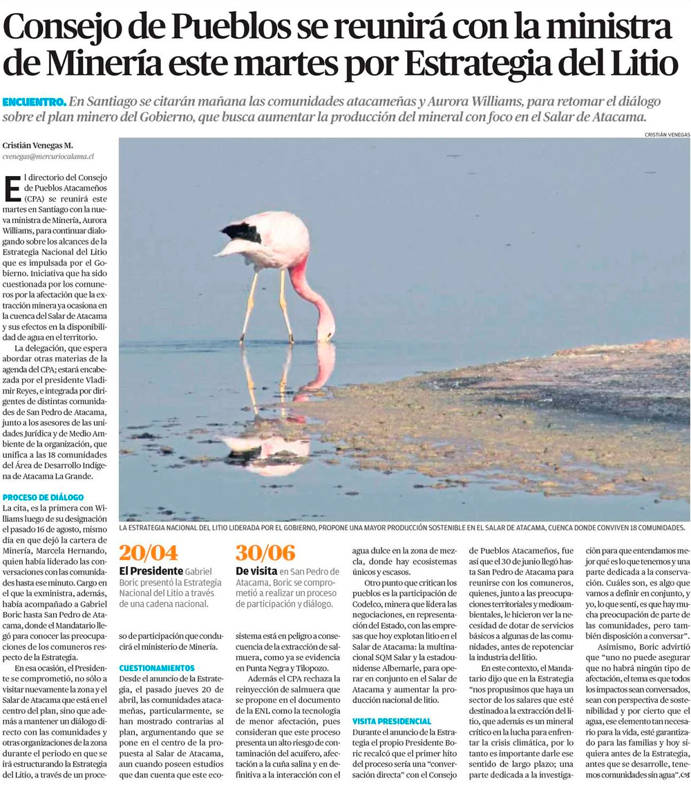 Comuneros se reunirÃan la próxima semana con la ministra Williams - (El Mercurio de Antofagasta)